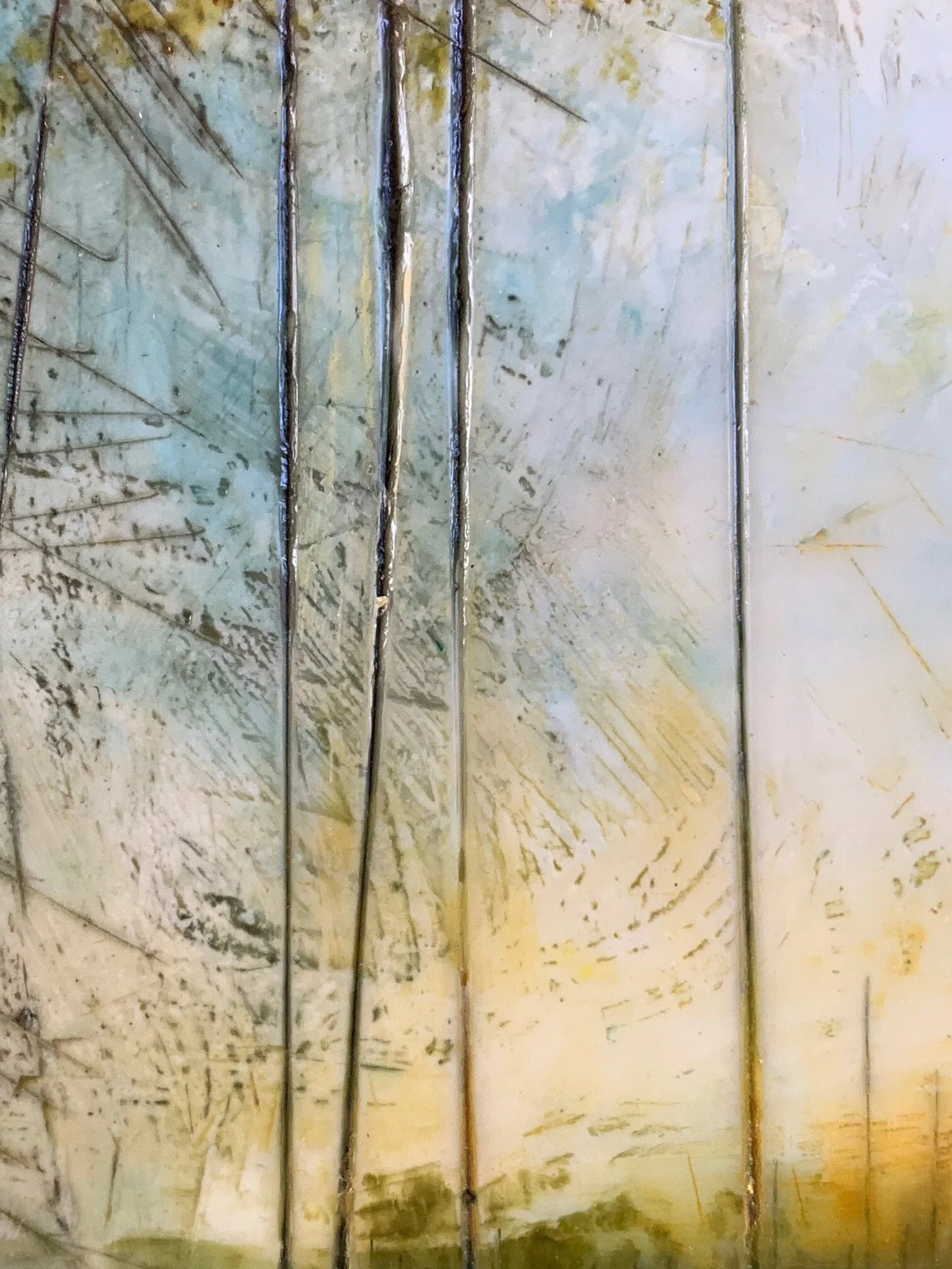Experimenting with watercolour and encaustic. The water-colour provides a sublte background for this painting, first painting of this series.