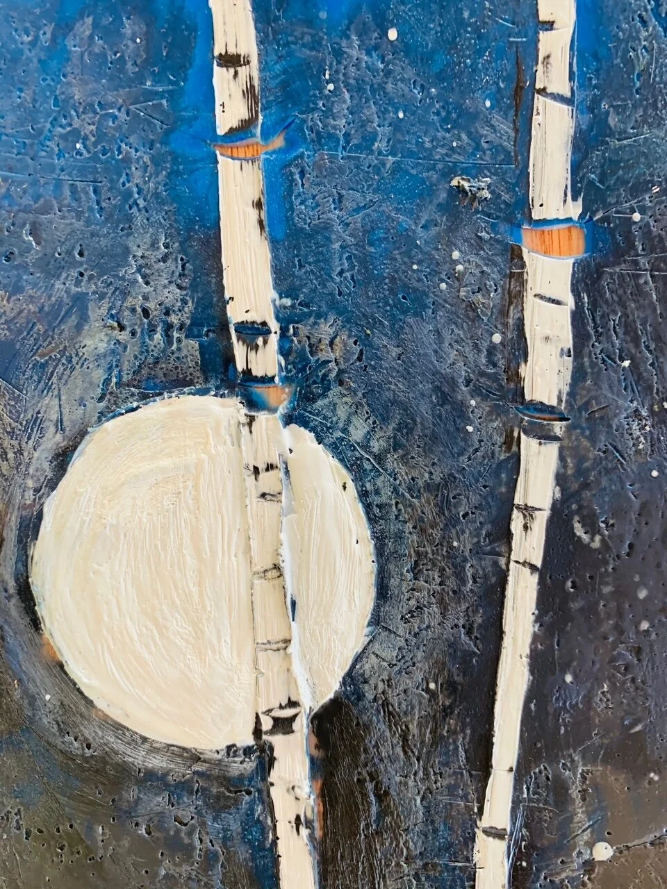 Two birch trees set against a sky of blues. There are many coloured layers in this painting. In the sky I scrape the layers of black to reveal the phthalo blue beneath. Accretion, a wax technique has been used on the snow as seen in the detailed shot revelaing a lighter blue beneath. The results is a quiet piece that speaks to the silence of a winter night under the moon.