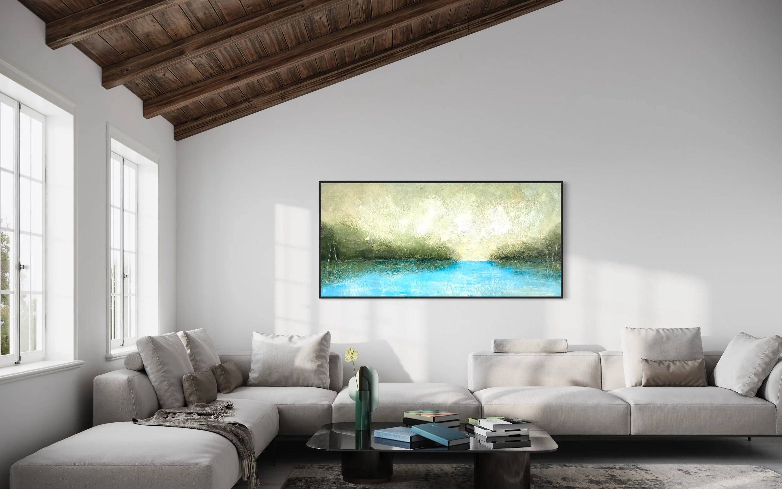 The second painting is a new addition to my Mystical Lake series. 'The Lake Beckons', 34 x 69 in is full of luscious texture so inherent of the encaustic medium.