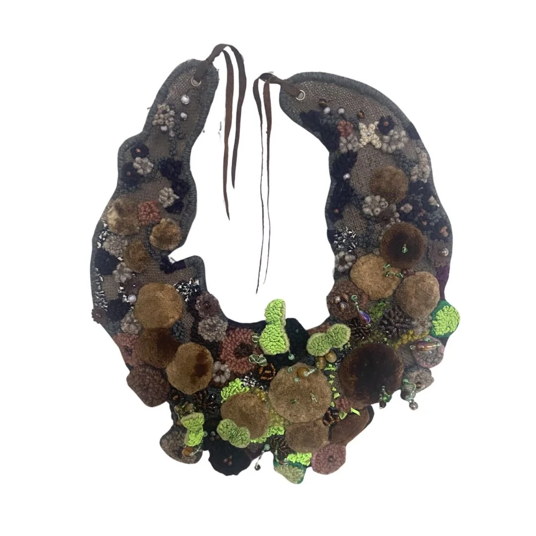 In her response, Carew reimagines the historical wreath as something alive and in motion. She envisions it sprouting and breaking free from the rigid constraints of its original design. Using hand-hooking techniques and mixed media featuring dyed cattail seeds, she transforms the wreath into a wearable collar. Through this transformation, Carew shifts the object from static display to embodied form, breathing new life into a tradition rooted in memory, craft, and sustenance.