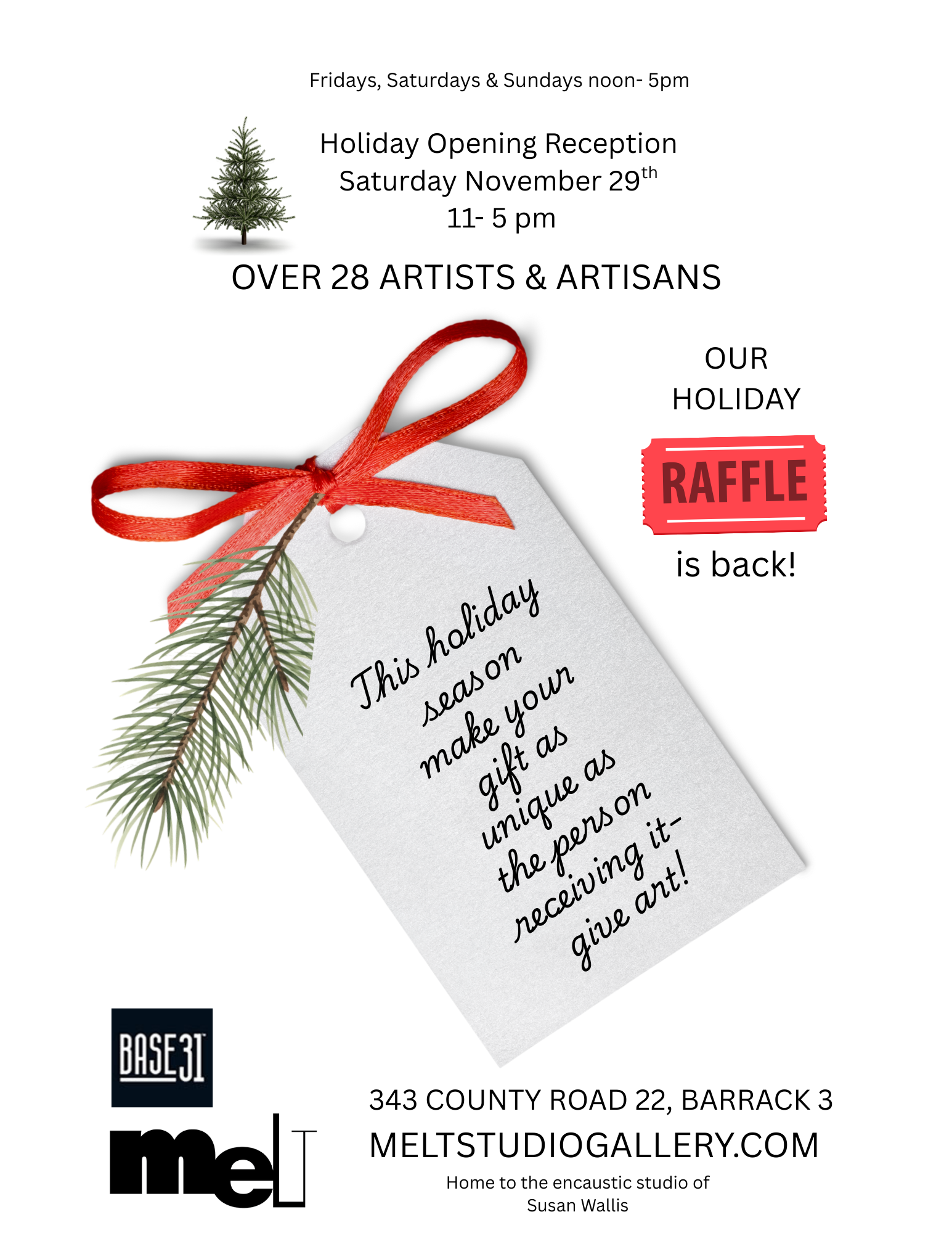 Give a little bit holiday group show & RaffleNovember 28th - December 28th Fridays, Saturdays & Sundays noon- 5pmOpening Reception- Saturday November 29th 11 am - 5 pmCoinciding with the vintage holiday market at BASE31Bur your raffle tickets here.